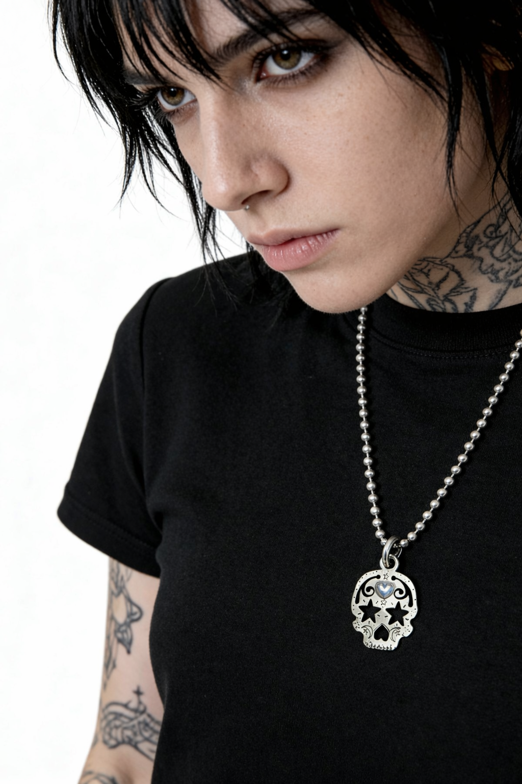 The Louise Skull Pendant features star-shaped eyes and a subtle heart detail — playful symbolism balanced with a bold, rock-forward edge.